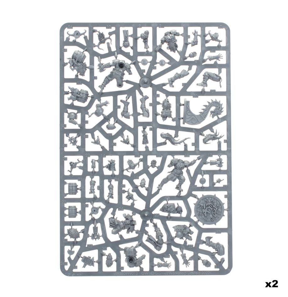 The multi-part kit is comprised of 120 plastic components with which you can assemble the Norsca Rampagers, a Norse team for use in games of Blood Bowl. The team is made up of 6 Norse Raider Linemen, 2 Beer Boar, 2 Norse Berserkers, 2 Ulfwereners and 2 Valkyries. In addition, there are 2 double-sided Blood Bowl coins, 2 turn and re-roll markers, 4 balls, and a transfer sheet with 292 decals.