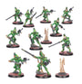 This multipart plastic kit builds 10 Striking Scorpion Aspect Warriors. These miniatures can be used as Blades of Khaine operatives in games of Kill Team, or fielded in Aeldari armies in games of Warhammer 40,000. Each miniature has an option for a bare head or helmet, and one in five can be built as an Exarch with a choice between a biting blade, twin chainswords, or a scorpion’s claw and chainsword. You'll also find two shrine statues in the kit.