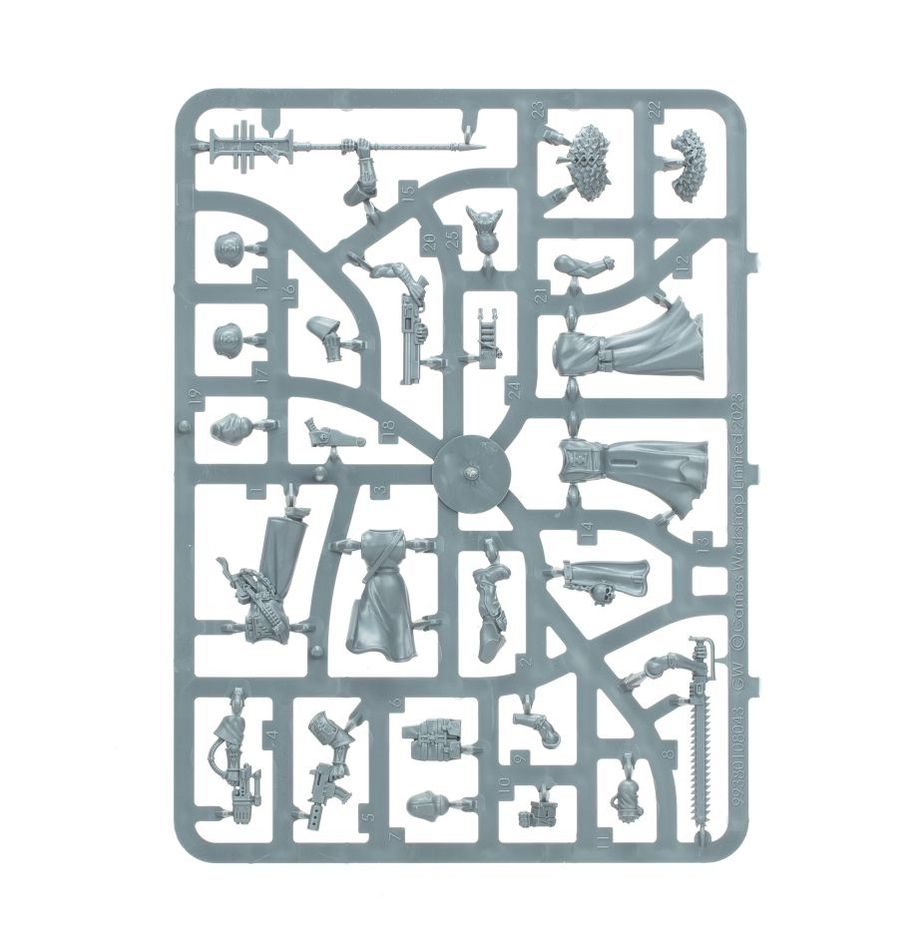 This multipart plastic kit builds seven Inquisitorial Agents, loyal acolytes of an Imperial Inquisitor. These miniatures can be used as Inquisitorial Agent operatives in games of Kill Team or as part of Imperial Agents armies in Warhammer 40,000. Most models in this hugely varied kit can be built as two completely different specialists – an Interrogator or Enlightener, a Questkeeper or Pistolier, a Mystic or Hexorcist, and a Death World Veteran or Penal Legionnaire. You'll also find an Autosavant, a Tome-skull, and a Gun Servitor that can be built with one of three weapons.
