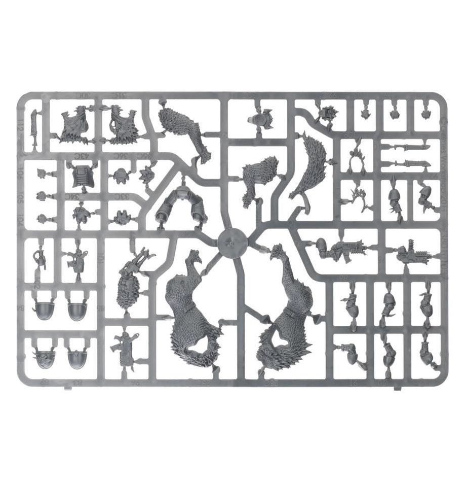 This multi-part plastic boxed set contains 121 components with which to build three Thunderwolf Cavalry models. This set comes with a selection of weaponry, including a frost blade, a power fist, a thunder hammer and three storm shields, as well as optional extras such as grenades, holstered bolt guns, bolt pistols and a choice of six different heads.