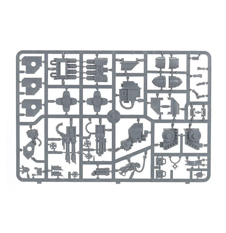 This box set contains one multi-part plastic Venerable Dreadnought. This 84-piece set includes: a plasma cannon, an assault cannon, lascannon, a heavy flamer, a storm bolter, two different power fists including an ornate one, and a set of smoke launchers. Also included are: two different sets of ornate leg guards, three different helmets, six purity seals, two different pennants, a range of different sarcophagus armour plates, several sarcophagus designs, and a host of Crux Terminatus and other Imperial icons.