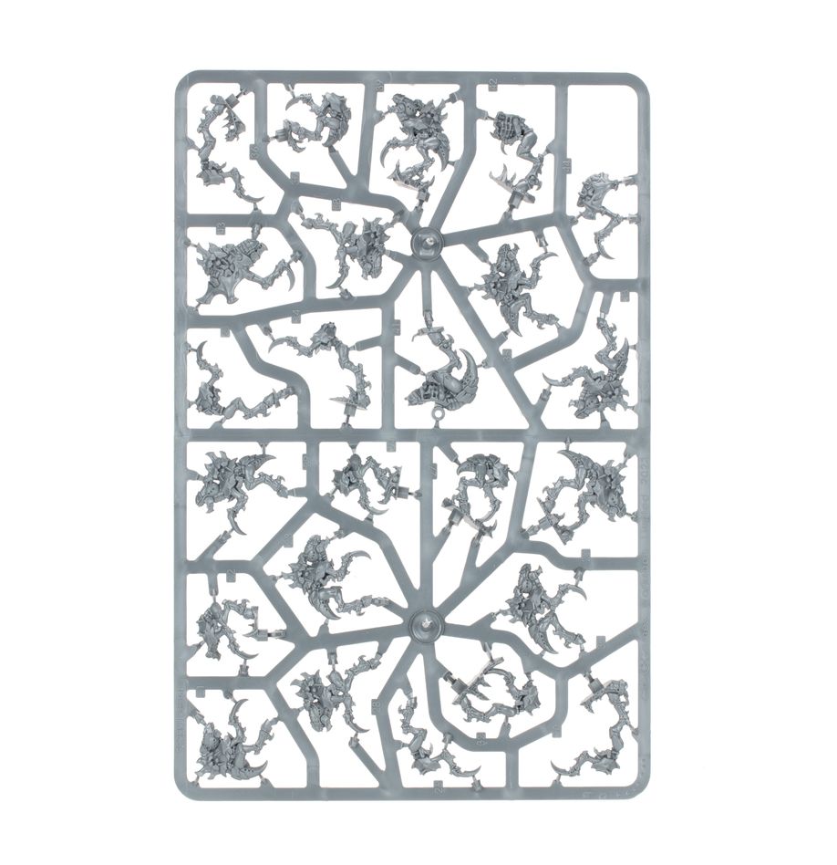 This multipart plastic kit builds 11 Neurogaunts, including an overgrown Neurogaunt Nodebeast. These strange, eyeless Tyranid creatures gnaw and scratch with needle-sharp claws and teeth, channelling the will of the Hive Mind through their hump-like spinal symbiotes. Each Neurogaunt has a different scuttling pose, encouraging you to flood the battlefield with a skittering horde that overwhelms weakened foes and distracts from larger beasts.