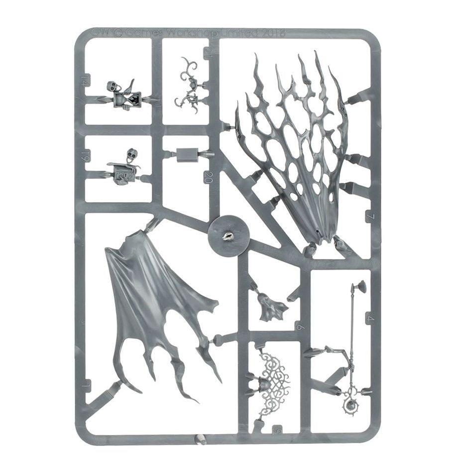This multi-part plastic kit contains the components necessary to assemble Lady Olynder, Mortarch of Grief. As the Mortarch of Grief, she is surrounded by an aura of absolute misery – this miniature does an impressive job of capturing the bleakness. Hovering above the ground in her ghastly bridal dress and veil, little can actually be seen of her form other than the outline of a skull. Her bridal train, ruined and shredded, flows out behind her, with a wisp of this ethereal garment attaching the miniature to its base. Thorny vines of grave-roses, which sprout wherever she floats, wrap themselves around her waist and up to her headdress, which itself resembles a thorned briar. In her right hand she wields the Staff of Midnight, an ornate stave topped with a polished gemstone of vitrified grave-sand. She is accompanied by 2 macabre Banshee Handmaidens, horrifying skull-faced spectres. Each carries a gift – an ensorcelled grave-sand hourglass given by Nagash himself which can be smashed asunder with lethal effect, and a sealed casket, the contents of which are a mystery; hardly likely to be anything at all positive...