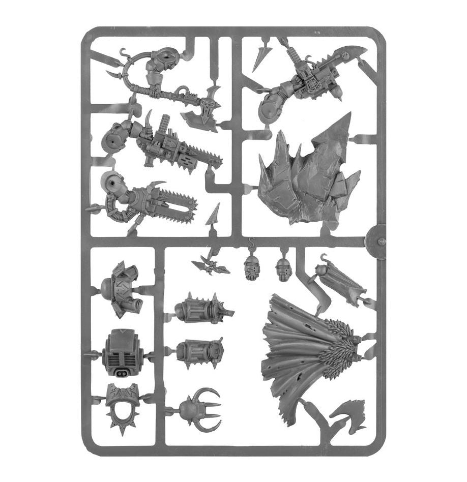 This multipart plastic kit builds a Chaos Lord in Terminator Armour miniature for use in Chaos Space Marines armies in games of Warhammer 40,000. This most elite of Heretic Astartes can be armed with a choice of weapons, including a combi-bolter or combi-weapon, chainfist, powerfist, exalted weapon, or a pair of accursed weapons. The miniature also includes the option of a bare or helmeted head, and can alternatively be built as a Sorcerer Lord in Terminator Armour.
