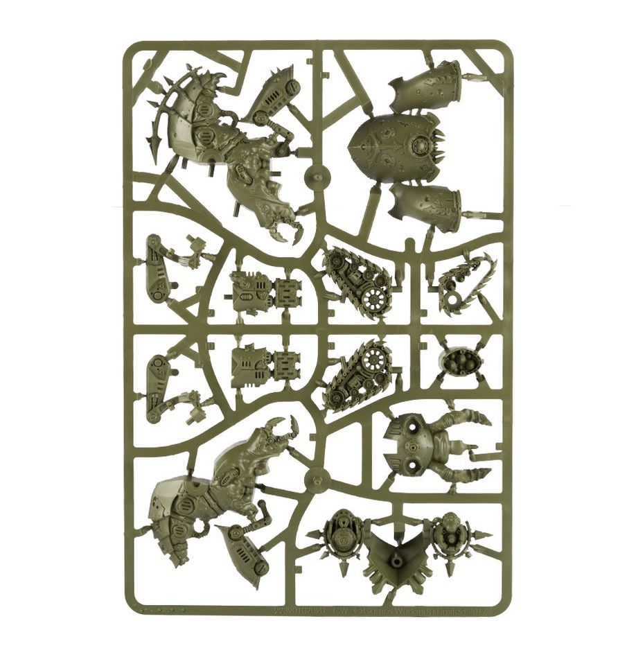 Powering into battle on a trio of articulated track units, the Myphitic Blight-hauler is a light Daemon Engine that provides the Death Guard with heavy firepower wherever it is needed. Resembling a Bloat-drone that has been stripped of its turbines, this strange machine has heavy weapons mounted on its carapace, and its rusting armoured plates can absorb impressive punishment – as can its blubbery exposed flesh-parts, which soak up appalling trauma.
