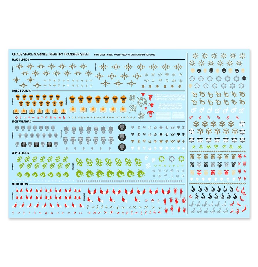 Each Chaos Space Marines Infantry Transfer Sheet features 569 high-quality waterslide transfers. These include Black Legion, Word Bearers, Alpha Legion, Night Lords, and Iron Warriors symbols, along with other Chaos markings to decorate your miniatures.