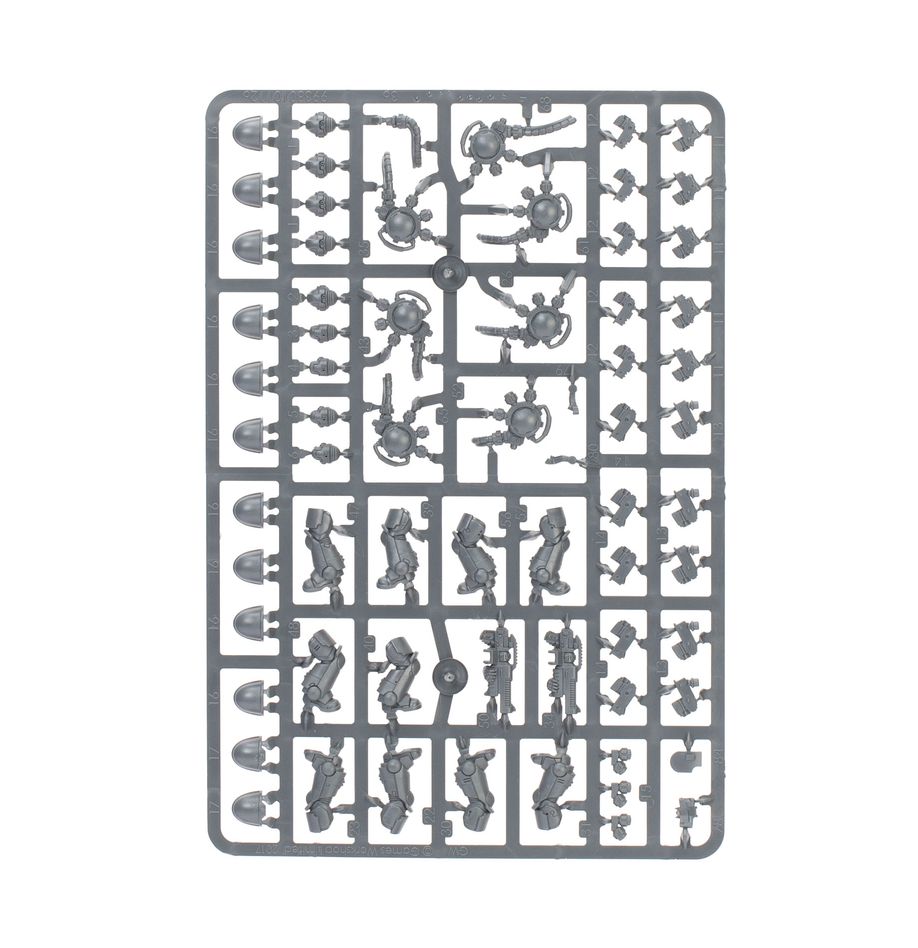 The Hellblasters can each be armed with one of three different styles of plasma incinerator. There are parts to build an optional Hellblaster Sergeant who can choose from one of two plasma incinerators, along with a bolt pistol, plasma pistol, or pointing hand. The heads, pistol holsters, purity seals, and plasma incinerators are interchangeable across the miniatures.