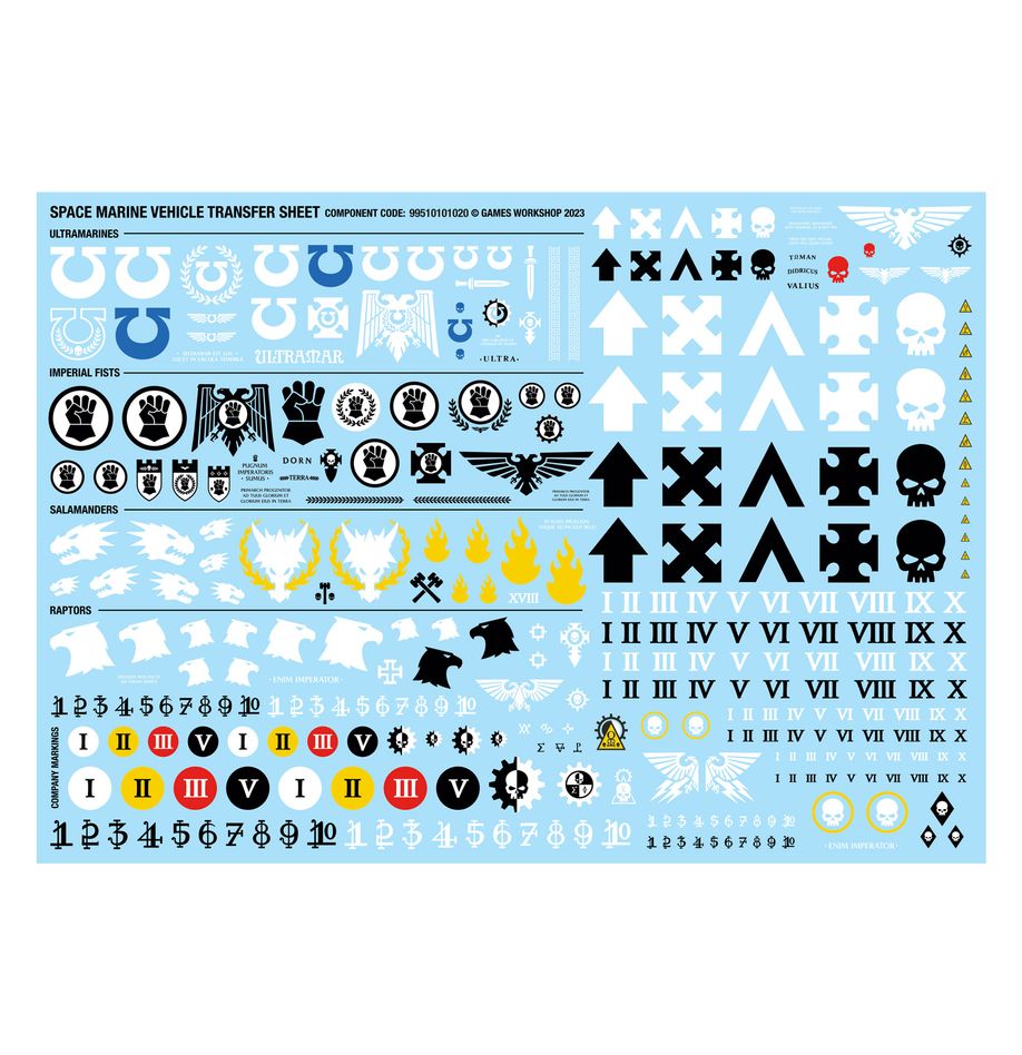 This kit is supplied with 2x Space Marine Infantry Transfer Sheets, each featuring 758 high-quality waterslide transfers, and 2x Space Marine Vehicle Transfer Sheets, each featuring 325 high-quality waterslide transfers. These include icons for the Ultramarines, Imperial Fists, Salamanders, and Raptors, along with company markings, vehicle markings, battlefield role indicators, and more.